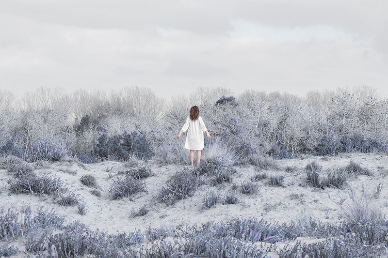 The verses of jisei no ku poetry often suggest a view of the death as a return of our body to the nature to which it belongs; for this reason all the photographs were shot in natural landscapes, later transformed through a free use of color, in order to create a dimension sited on the boundary between reality and imagination.